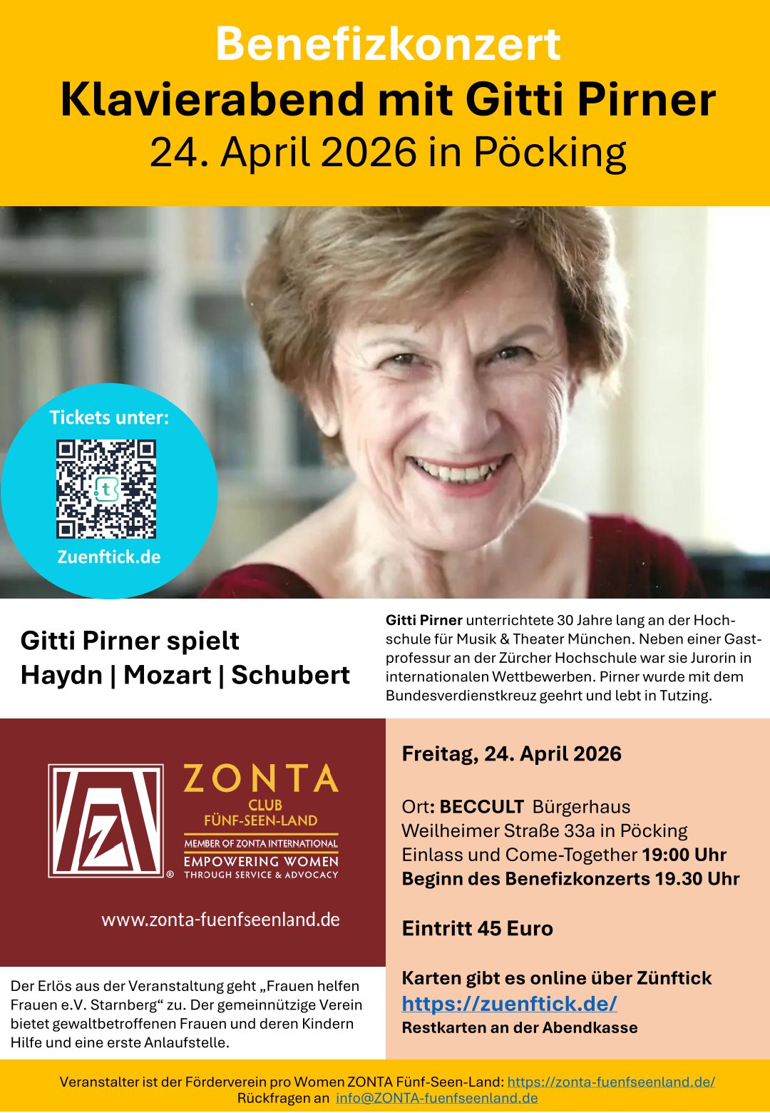 Der ZONTA Club Fünf-Seen-Land lädt herzlich zu einem besonderen Benefizkonzert ein: Am Freitag, 24. April 2026, spielt die renommierte Pianistin Gitti Pirner im BECCULT Bürgerhaus in Pöcking Werke von Haydn, Mozart und Schubert. Konzertbeginn ist 19:30 Uhr, Einlass und Come-Together starten bereits um 19:00 Uhr.