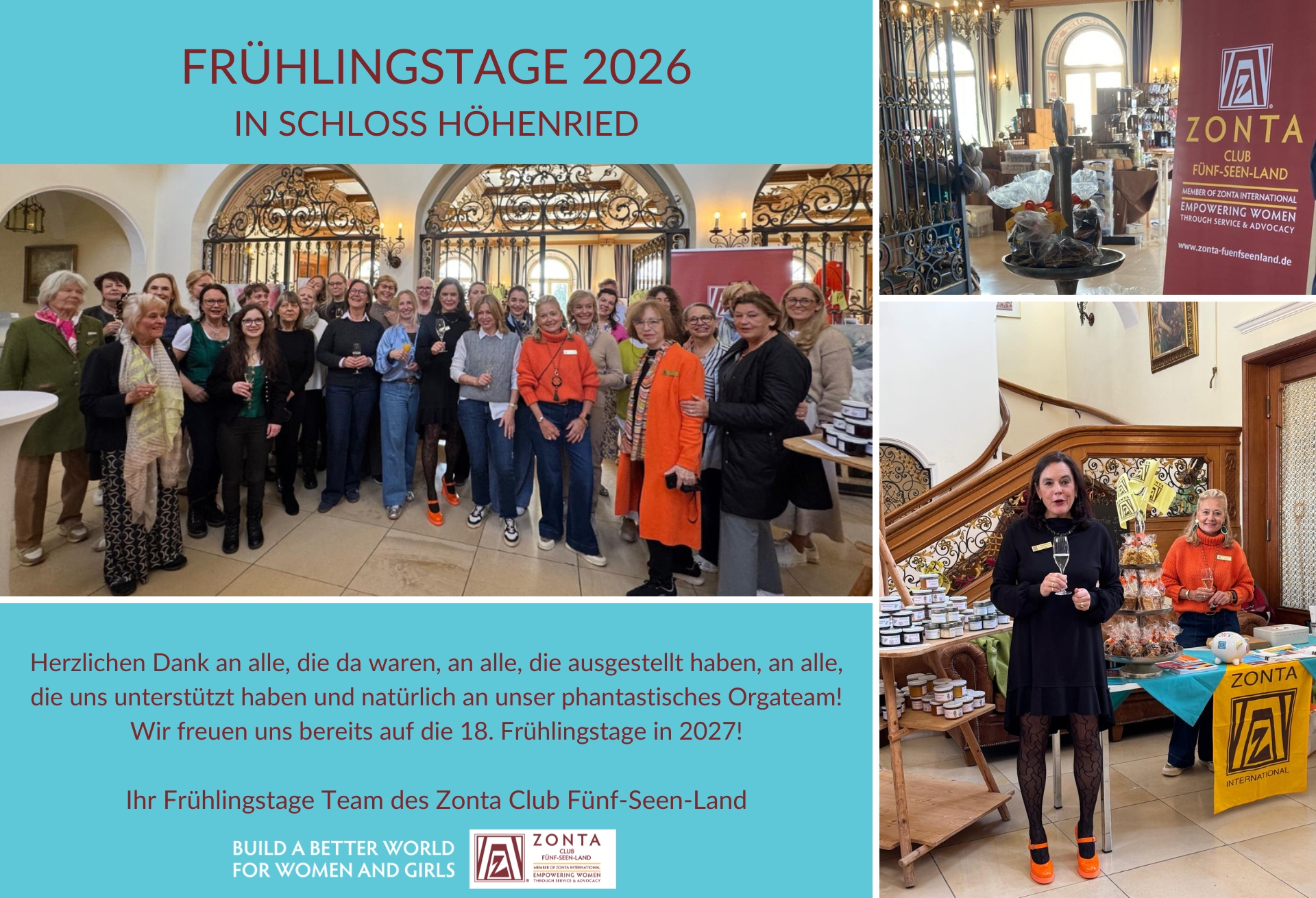 Die Frühlingstage 2026 des Zonta Clubs Fünf-Seen-Land im Schloss Höhenried waren ein voller Erfolg! Am 14. und 15. März verwandelte sich das malerische Schloss in Bernried erneut in einen lebendigen Benefizmarkt, der zahlreiche Besucherinnen und Besucher anzog. Dank der vielfältigen Auswahl an Ausstellerinnen und Ausstellern, die mit Herzblut ihre einzigartigen Produkte präsentierten – von handgefertigtem Kunsthandwerk über modische Accessoires bis hin zu kulinarischen Köstlichkeiten – war für jeden Geschmack etwas dabei.